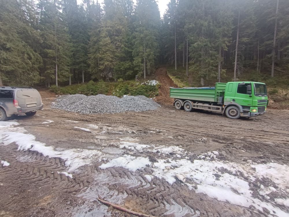 Ani v závere roku 2025 sme nenechali nič na náhodu a pred zimou, ale najmä jarou bohatou na vodu odtekajúcu po povrchu sme obnovili pozdĺžne odvodnenie lesnej cesty v lokalite Zabiedovčík. Obnova "garáda" prebehla v dĺžke cesty približne 520 metrov. Okrem toho sme vyčistili lesné sklady (počet skladov: 2) od nánosov blata. Opravili sme poškodené úseky na lesnej ceste, kde sa koruna vozovky nebezpečne nachýlila do strany k odvodňovacím priekopam. Túto opravu sme vykonali na dvoch úsekoch v spoločnej dĺžke približne 30 metrov. Na posledný sklad sme naviezli kamenivo (frakcia 0/63) v množstve 136,26 tony. Tento materiál plánujeme použiť v roku 2026 na opravu poškodeného úseku lesnej približovacej cesty za posledným skladom v Zabiedovčíku, smer Priehyba. Pri týchto prácach sme doviezli materiál aj pre Urbár Zábiedovo ako nájom za využívanie ich lesnej cesty pri bežnom hospodárení v lesoch, konkrétne drvený asfalt v množstve 35,25 tony.